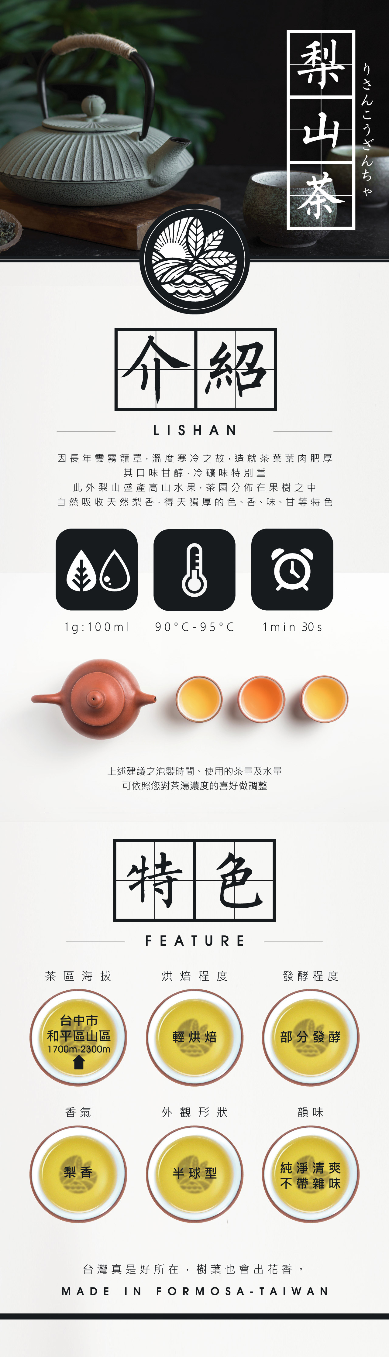 梨 山 盛 產 高 山 水 果,茶 園 分 佈 在 果 樹 之 中,自 然 吸 收 天 然 梨 香,得 天 獨 厚 的 色、香、味、甘 等 特 色
