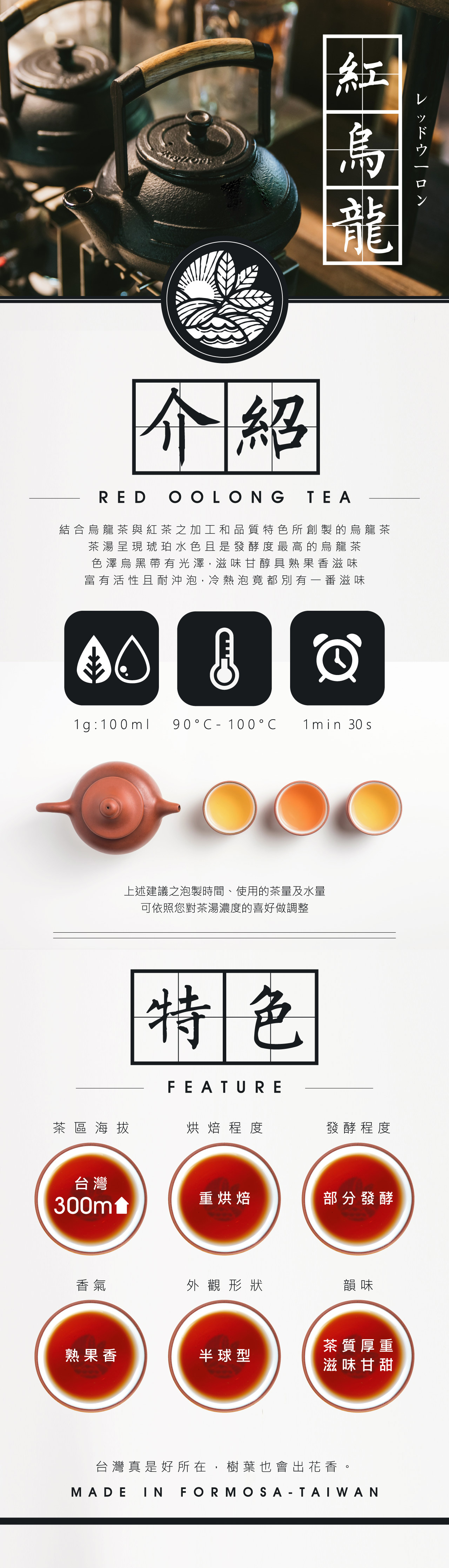 結 合 烏 龍 茶 與 紅 茶 之 加 工 和 品 質 特 色 所 創 製 的 烏 龍 茶,茶 湯 呈 現 琥 珀 水 色 且 是 發 酵 度 最 高 的 烏 龍 茶,色 澤 烏 黑 帶 有 光 澤,滋 味 甘 醇 具 熟 果 香 滋 味,富 有 活 性 且 耐 沖 泡,冷 熱 泡 竟 都 別 有 一 番 滋 味。