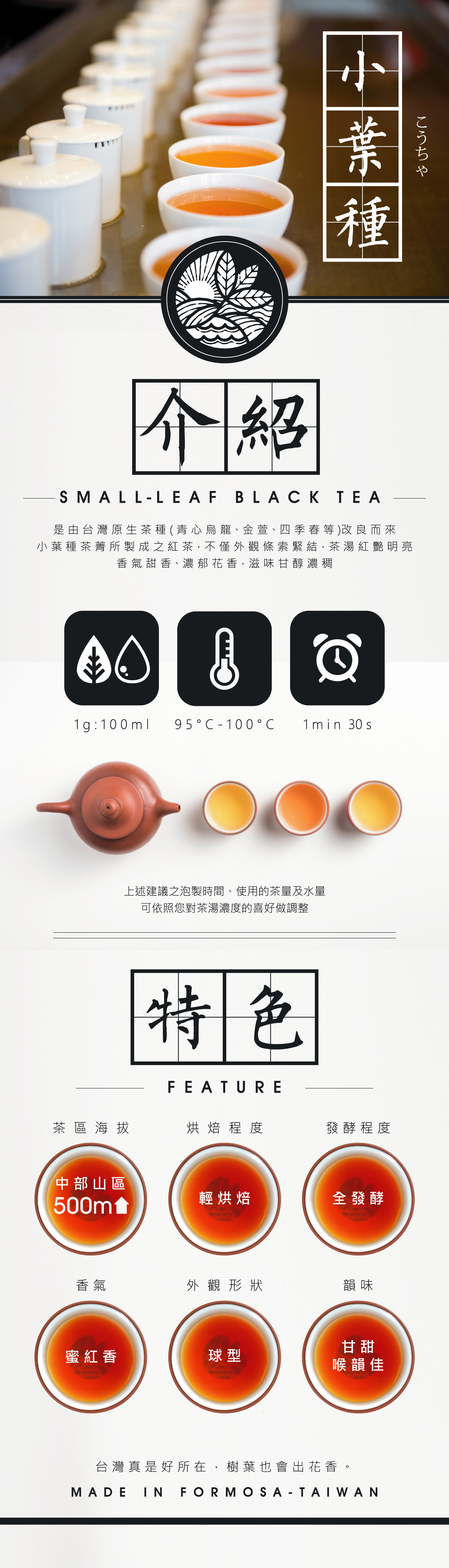 是 由 台 灣 原 生 茶 種 ( 青 心 烏 龍、金 萱、四 季 春 等 )改 良 而 來,小 葉 種 茶 菁 所 製 成 之 紅 茶,外 觀 條 索 緊 結,茶 湯 紅 艷 明 亮,香 氣 甜 香、濃 郁 花 香,滋 味 甘 醇 濃 稠。