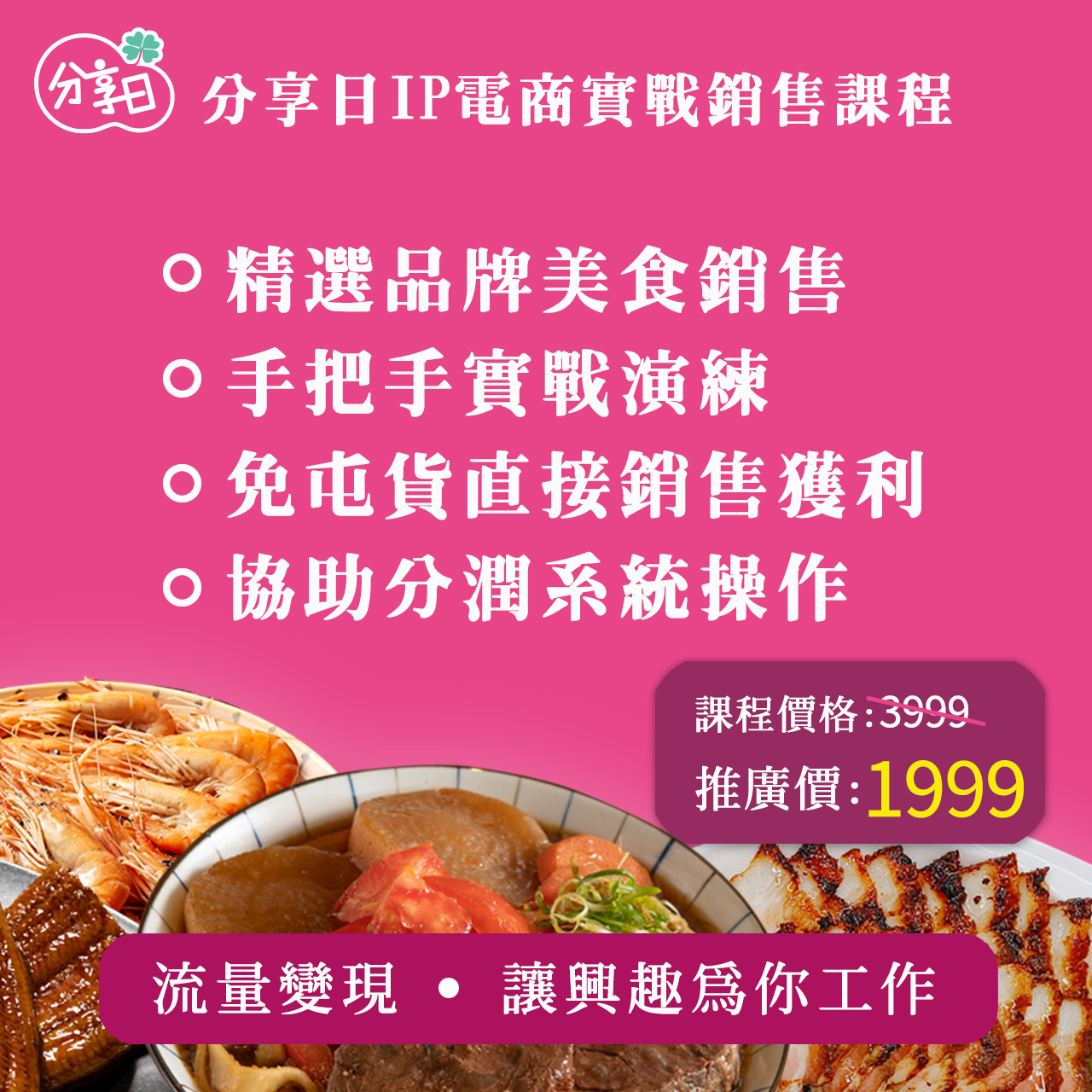 課程結束後直接引導銷售「分享日」上的精選商品,並協助開啟 ”分享日聯盟行銷帳號”,平台銷售系統設計簡單易了解,專人協助快速上手銷售! 免屯貨、免開店、免包裝貨物,金物物流幫您一次都搞定 ! 並會在後台提供您300元購物體驗金 讓您立即挑選購買最想賣的體驗商品。