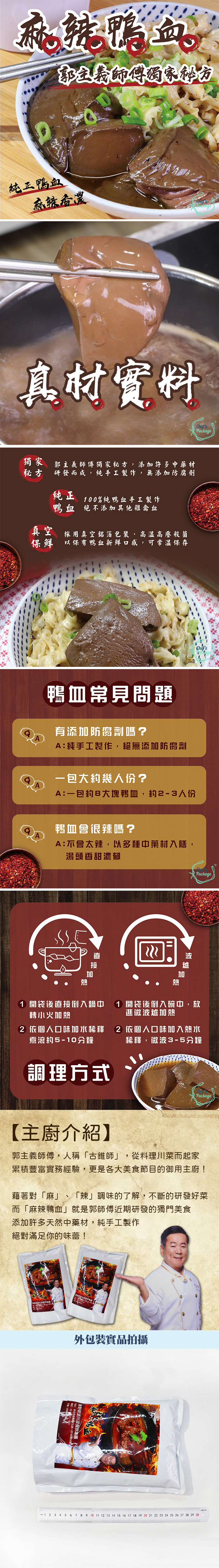成 份:鴨血、辣油、花椒、蒜頭、薑、食用油、醬油、米酒、高湯、蔥、鹽巴