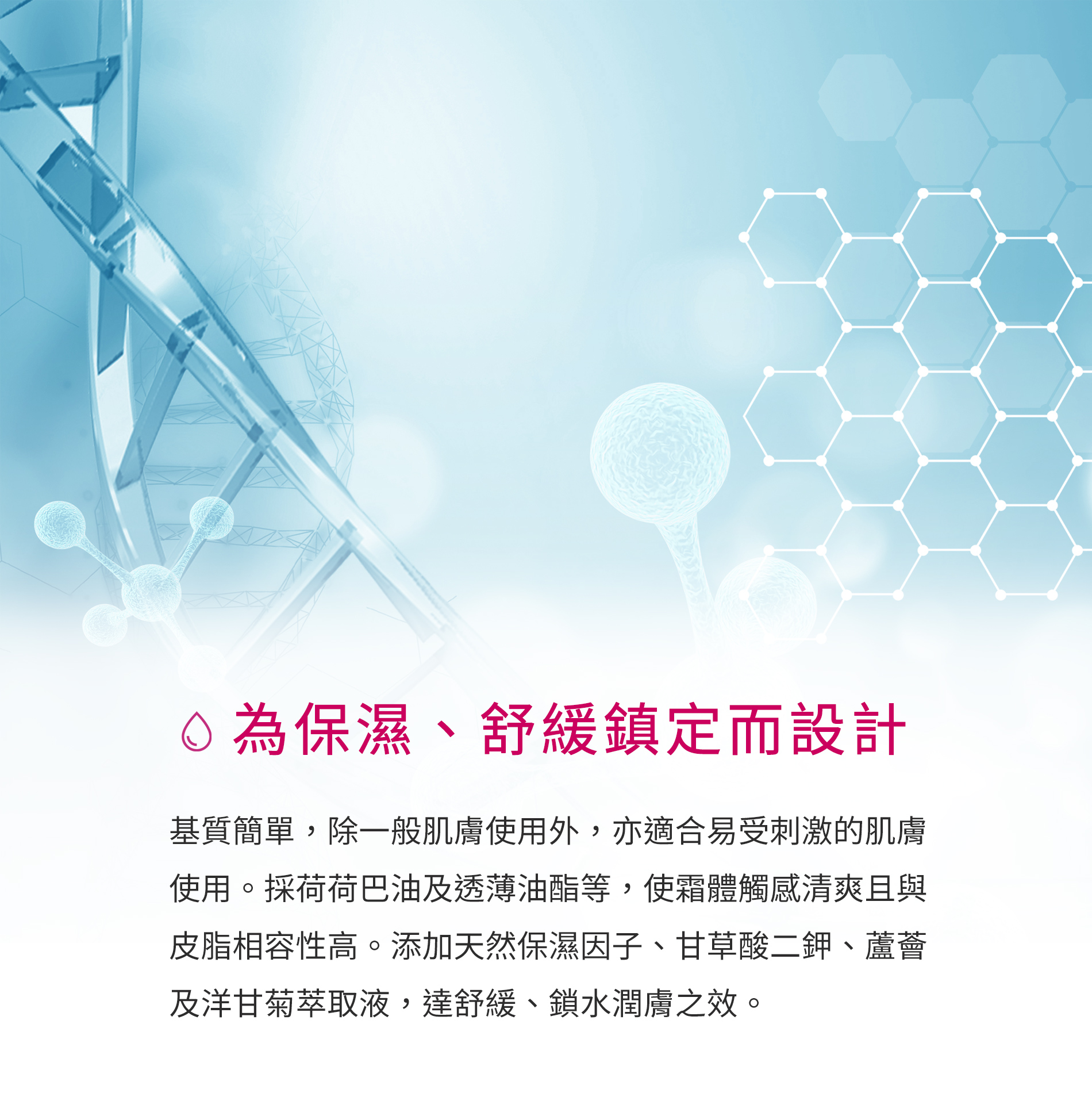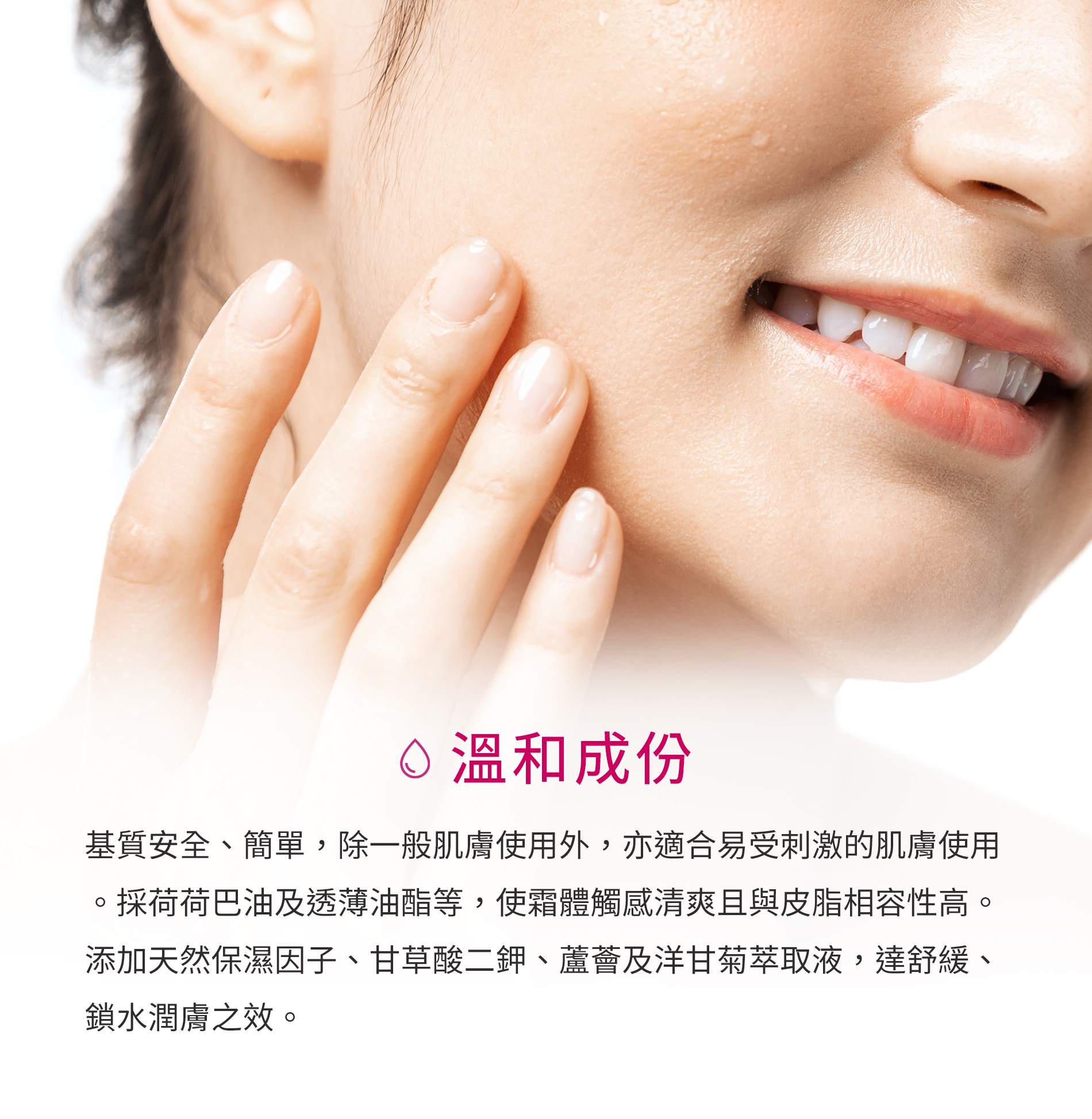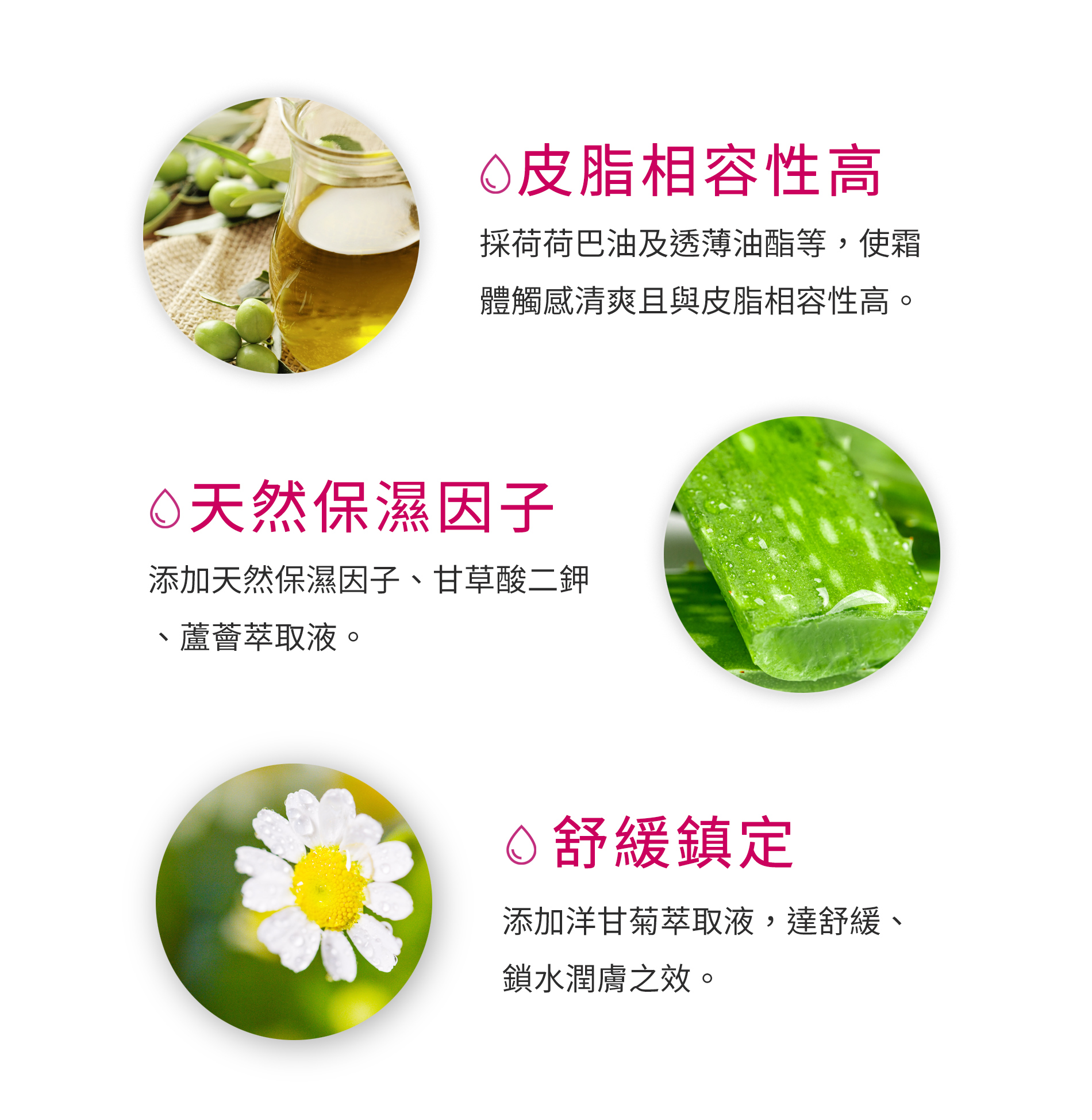 基質安全、簡單,除一般肌膚使用外,亦適合易受刺激的肌膚使用。採荷荷巴油及透薄油酯等,使霜體觸感清爽且與皮脂相 容性高。添加天然保濕因子、甘草酸二鉀、蘆薈及洋甘菊萃取液,達舒緩、鎖水潤膚之效。