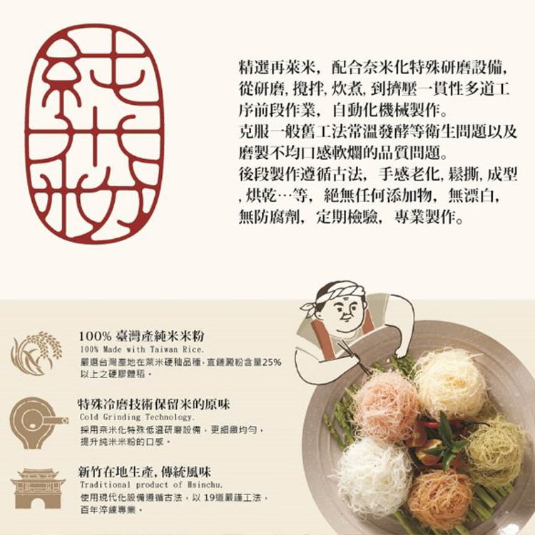 隨著養生健康食材的風氣盛行,越來越多人開始找尋「米粉的初味」,那一份來自稻米原香的純米粉,由米與風、水所形成的單純「風味」。