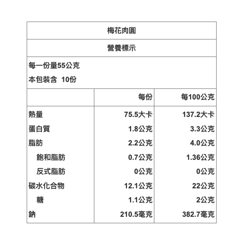 內容物:肉圓(55公克/10顆)、醬包(25公克/2包)、辣椒包(15公克/2包)