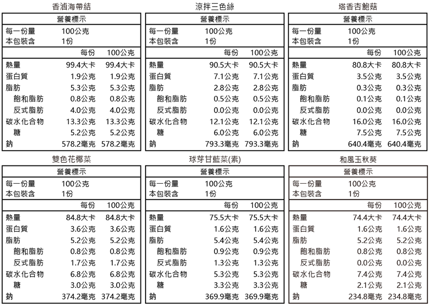 品項(隨機出貨):香滷海帶結/涼拌三色絲/塔香杏鮑菇/雙色花椰菜/球芽甘藍菜(素)/和風玉秋葵