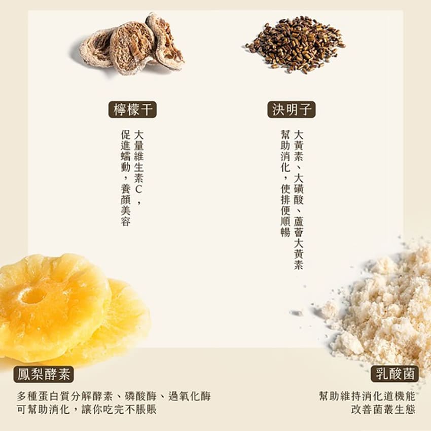 成份:山楂、陳皮、生何首烏、決明子、桑葉、甘草、荷葉、檸檬乾、乳酸菌、鳳梨消化酵素