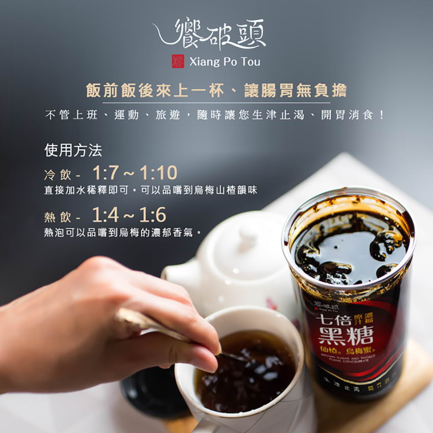 內容物:黑糖(蔗糖)、山楂、烏梅 淨重 : 1000g 保存期限 : 12個月 注意事項:避免陽光直射,開封後請冷藏。 使用方法 : 冷飲- 1:7~1:10。直接加水稀釋即可。冷飲可以品嚐到烏梅山楂韻味 熱飲- 1:4~1:6。 熱泡可以品嚐到烏梅的濃郁香氣。
