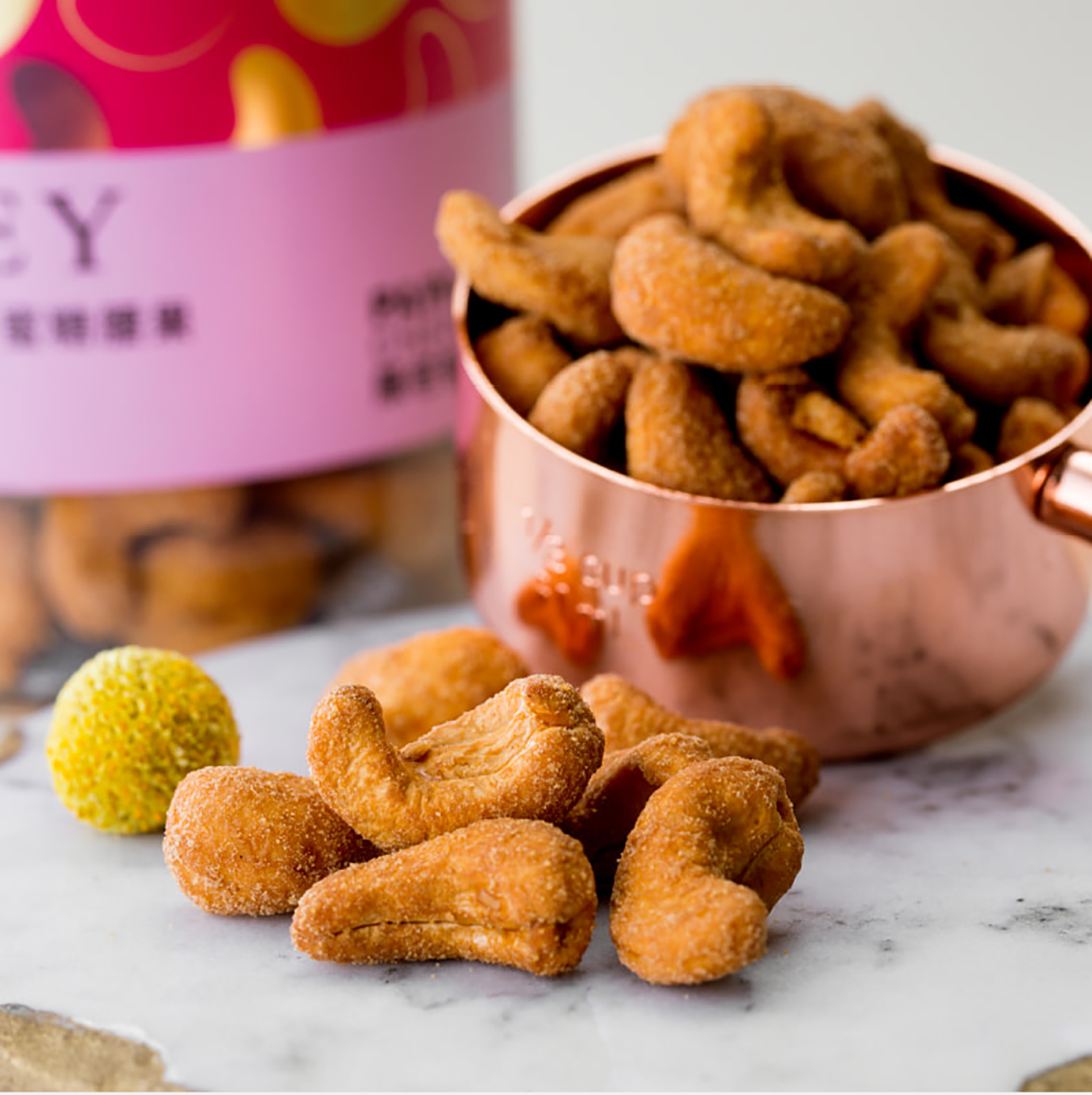遵循傳統拌炒製作,飽滿的腰果融合入薄薄的脆皮蜜汁糖衣