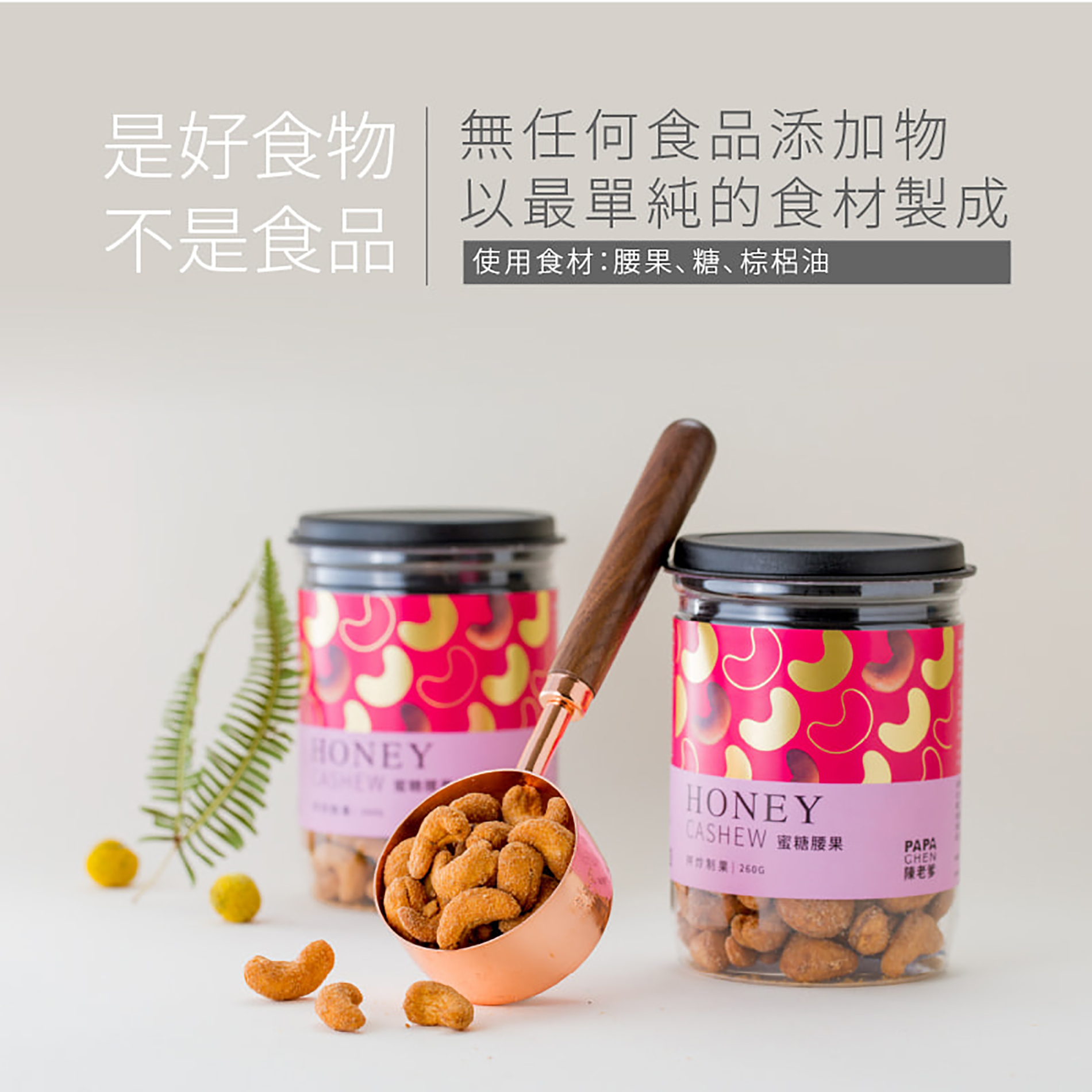 使用來自越南,通過無農藥及黃麴毒素檢驗合格的腰果仁,遵循傳統拌炒工法製作,越咀嚼越吃得到腰果的天然甜味,與市售使用烘烤製作的腰果,有著截然不同的口感。