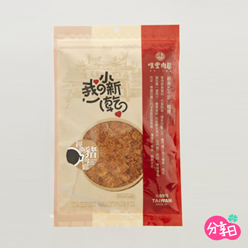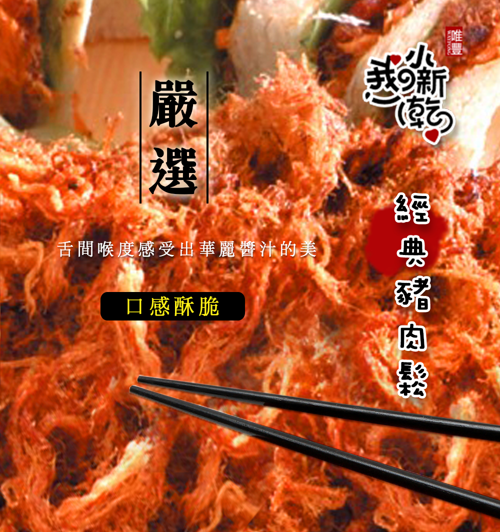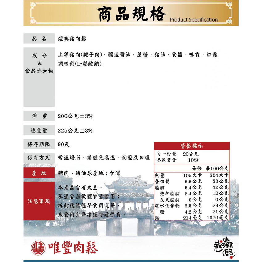 老老闆的叮嚀!不變的堅持「三斤豬肉烘製一斤肉鬆」無添加、不染色、不添加防腐劑及人工色素。用心做台北人幸福滋味的肉品,以城市美學的人文概念,提昇自然美食文化,傳承老味道的風華,吃得養生也要吃得健康,遠離黑心食品的困擾。我們通過ISO22000-HACCP國際品質認證,食品安全把關,讓您安心放心。【台北ㄟ人情味】唯豐肉鬆食品!