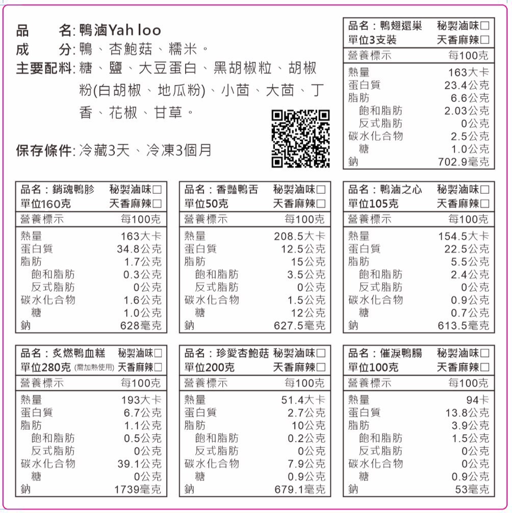 鴨滷 Yah Loo嚴選新鮮食材加上定量滷製,無添加防腐劑, 建議您當天未食用完畢,放入冰箱冷凍。最佳賞味期為冷藏(雪櫃)5℃保鮮3天、冷凍(冰格)-20℃20天,冷凍保存3個月。