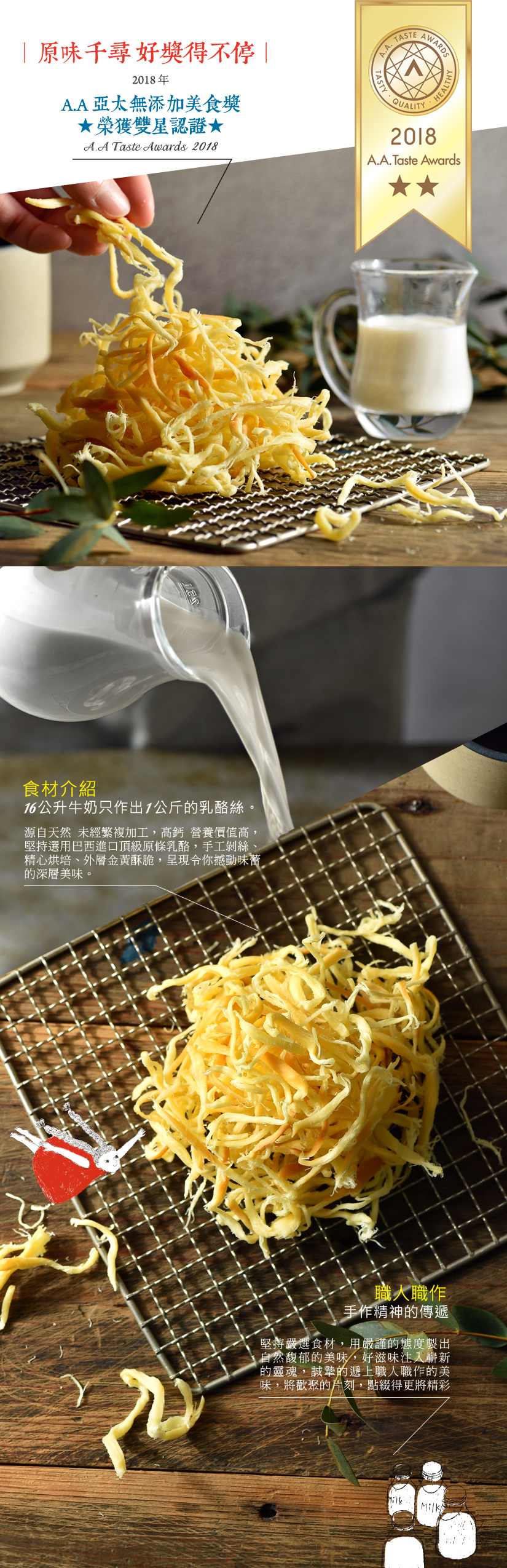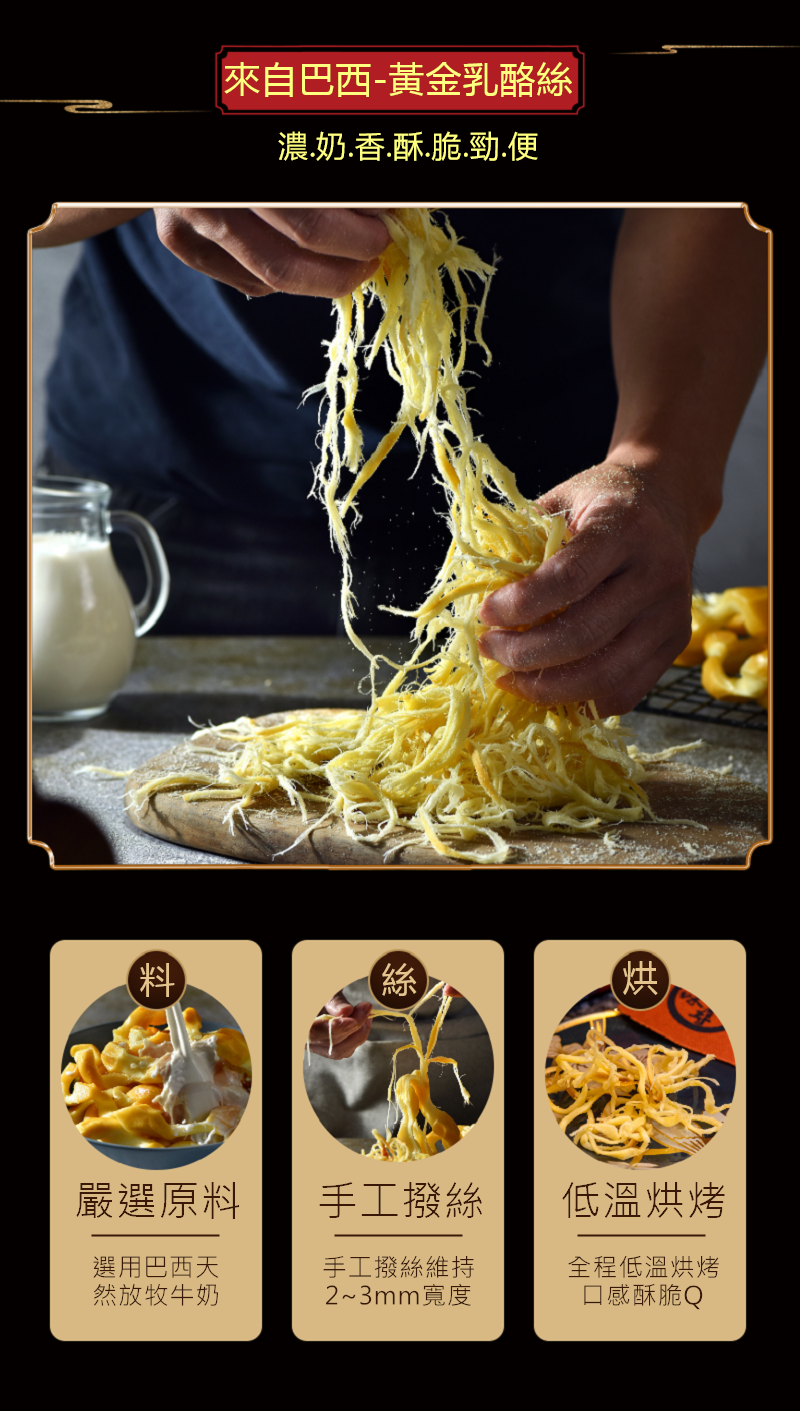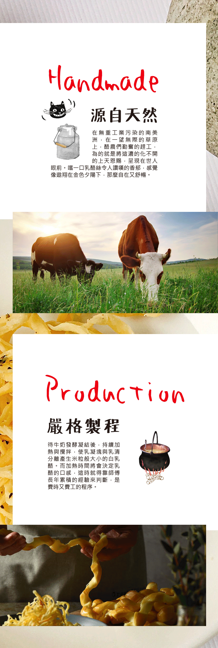 在無重工業污染的南美洲,在一望無際的草原上,酪農們勤奮的趕工,為的就是將這濃的化不開的上天恩賜,呈現在世人眼前。嚐一口乳酪絲令人讚嘆的香郁,感覺像遨翔在金色夕陽下,那麼自在又舒暢。