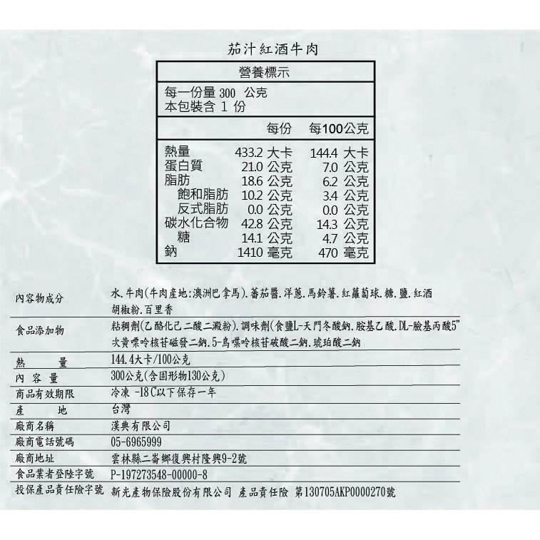 ➤品名:【漢典食品】茄汁紅酒燉牛肉