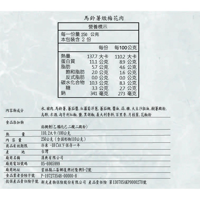 ➤品名:【漢典食品】馬鈴薯燉梅花肉