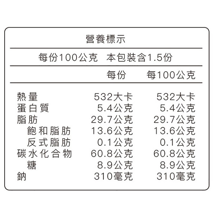◆成 份: 馬鈴薯、棕櫚油、糖、奶粉、蛋黃、鹽、5’-次黃嘌呤核苷磷酸二鈉、5’-鳥嘌呤、核苷磷酸二鈉、香料