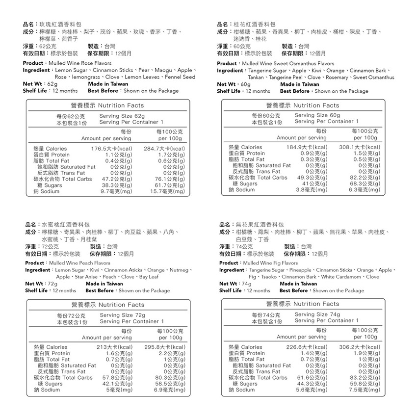 果乾是我們的本業,所以水果量一定是量多滿足的~!水果風味的紅酒香料包的特殊水果味有水蜜桃與無花果,不同層次的果香,同樣帶給人甜蜜的幸福滋味。