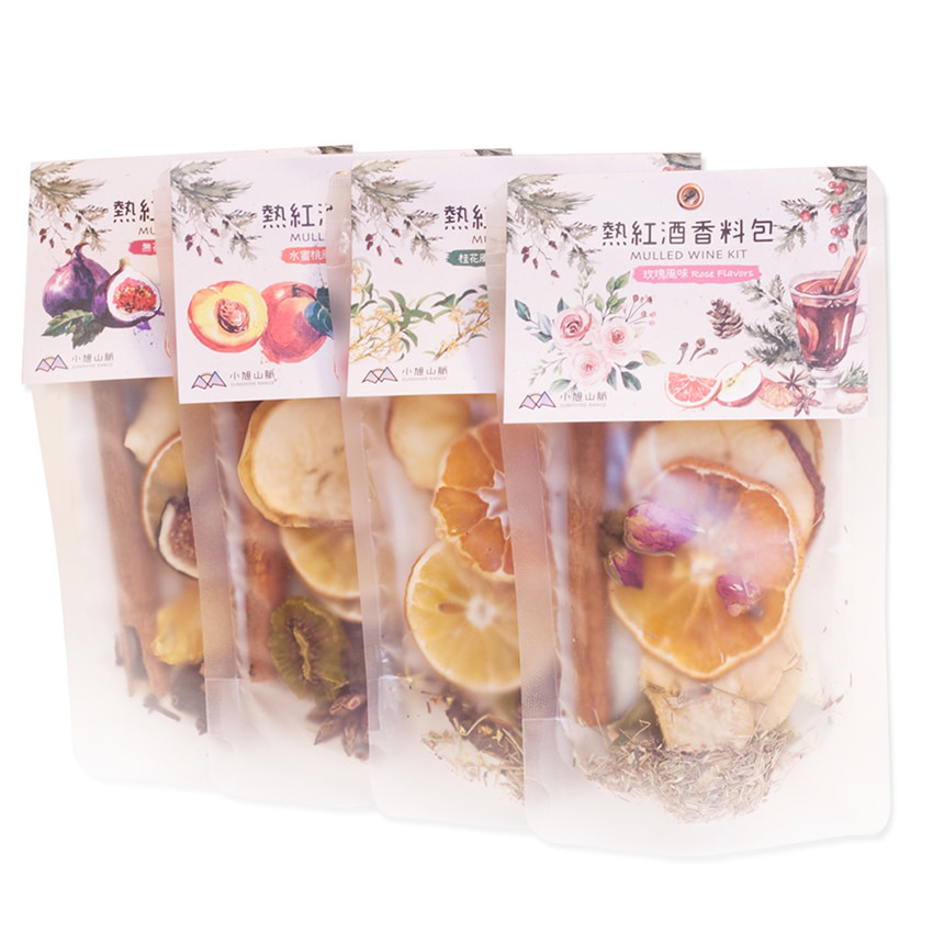 熱紅酒的主要魅力元素為:香料、水果、紅酒。小旭山脈的熱紅酒香料包,含有最豐富多種的水果乾,加上不同配方的特調香料,絕對料多滿足,手作的柑橘糖跟檸檬糖,將柑橘類水果的皮削成屑,混入冰糖成為獨家風味,1包香料包適用於一瓶750ml的紅酒,方便又美味,聖誕節交換禮物拿出這一包,讓您成為最受歡迎的焦點人物!