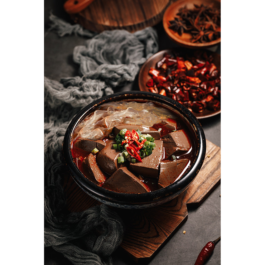 調理包&油包成份:水、雞骨、鴨血【鴨血、水、鹽、焦磷酸鈉、多磷酸鈉、偏磷酸鉀、矽樹脂、脂肪酸山梨醇酐酯、聚山梨醇酐脂肪酸酯、羧甲基纖維素鈉】、麻辣醬【沙拉油、芝麻香油(大豆油、芝麻)、辣豆瓣醬(蠶豆、精鹽、辣椒)、酒釀(米、酒麴、水)、紅蔥、蒜、糖、鹽、胡椒、甘草、肉桂、草果、八角、豆蔻、朝天椒、大紅袍、雞心椒】、鹽、L-麩酸鈉。