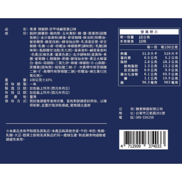 ※本產品含有甲殼類及其製品,本產品與其他含蛋、牛奶、羊奶、魚類、乳糖、大豆、麩質之穀物及其製品於同一產線生產,對此食物過敏者請避免食用。