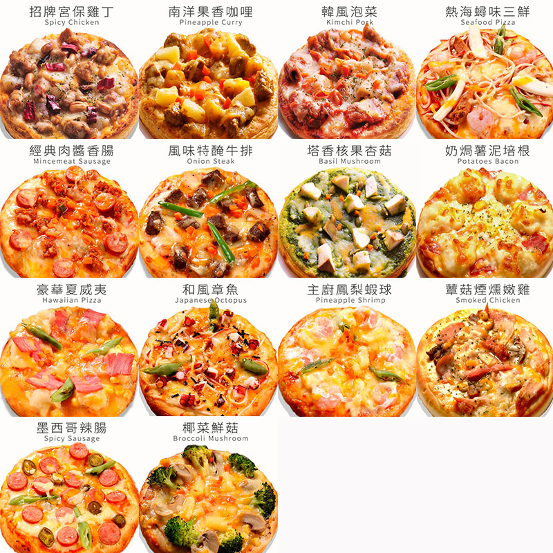 內容物:火腿、雞肉、鳳梨、起司、麵粉、洋蔥、紅椒、芹菜、迷迭香、蕃茄醬、沙拉、紅蘿蔔、花椰菜、橄欖油、發酵粉、糖、鹽、義大利香料。