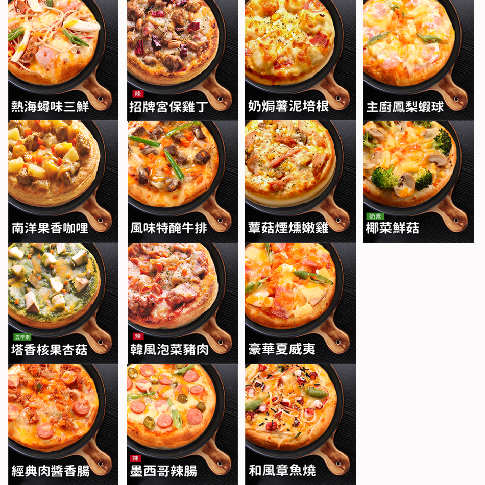 內容物:蝦仁、魷魚、蟹肉絲、起司、麵粉、洋蔥、紅椒、芹菜、迷迭香、蕃茄醬、紅蘿蔔、花椰菜、橄欖油、發酵粉、鹽、黑胡椒、義大利香料。